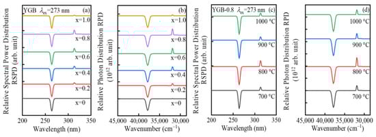 In order to evaluate the optical property of Gd3+-Bi3+ co-doped YGB phosphors with different Gd3+ contents and annealing temperatures, the relative spectral power distributions and relative photon distributions were determined and compared, as in Figure 7a–d. Under the 273 nm excitation, the sharp narrow-band UVB emission at 313 nm that originates from the 6PJ→8S7/2 transition increases significantly with the increase in Gd3+ content and annealing temperature, which reaches the maximum value while the Gd3+ content is x = 0.8 and is annealed at 800 °C. This should be attributed to the increased energy transfer caused by the reduced distance among Gd3+-Gd3+ ion pairs [41]. The relative photon distribution provides fundamental information with respect to optical fields and relevant applications. Depending on the relative spectral power distribution P(λ), photon distribution N(ν) can be deduced by , where ν, λ, h, c, and P(λ) represent wavenumber, wavelength, Planck constant, vacuum light velocity, and spectral power distribution, respectively [42]. Here, the abscissae of the distribution spectra were converted to a wavenumber (cm−1) for accurate deconvolution. The net absorption and emission photon distribution curves of Gd3+-Bi3+ co-doped YBO3 phosphors were derived, as presented in Figure 7b,d, and their net emission and absorption intervals were selected at 30,300–33,300 cm−1 (corresponding to 313 nm) and 36,300–39,200 cm−1 (corresponding to 273 nm).