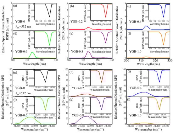 (a–f) Relative spectral power distributions and (g–l) relative photon distributions of Y0.9(GdxBi1−x)0.1BO3 (x = 0, 0.2, 0.4, 0.6, 0.8 and 1.0) phosphors annealed at 800 °C under the 532 nm excitation.