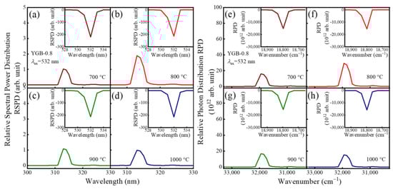 (a–f) Relative spectral power distributions and (e–h) relative photon distributions of YGB-0.8 samples with different annealing temperatures from 700 °C to 1000 °C under the 532 nm excitation.