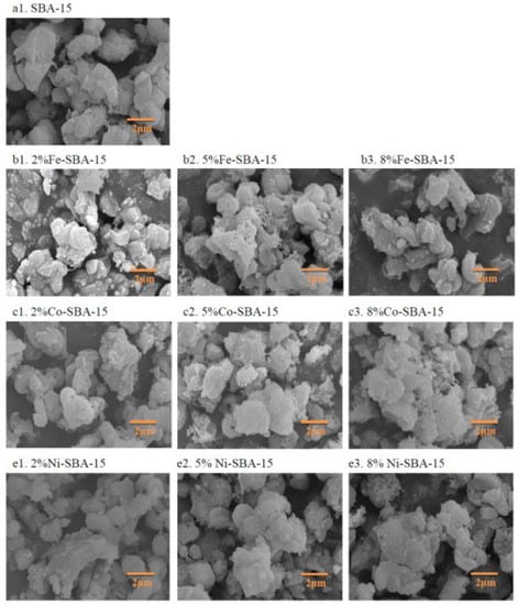For SBA-15, the average particle sizes were 3.1 ± 1.4 μm (in the range of 1.2–4.9 μm) according to the SEM photos (Figure 1). The iron-impregnated SBA-15 particle sizes were 2.9 ± 0.8 μm for 2% Fe-SBA-15, 2.4 ± 0.6 μm for 5% Fe-SBA-15, and 3.2 ± 0.8 μm for 8% Fe-SBA-15. The average particle sizes were 3.7 ± 1.3 μm for 2% Co-SBA-15, 3.0 ± 1.2 μm for 5% Co-SBA-15, and 3.6 ± 1.4 μm for 8% Co-SBA-15. In addition, the average particle sizes were 2.9 ± 1.7, 4.5 ± 1.2, and 4.2 ± 1.3 μm for 2% Ni-SBA-15, 5% Ni-SBA-15, and 8% Ni-SBA-15, respectively. There were insignificant differences in average particle sizes between SBA-15 and metal (2–8 wt% of Fe, Co, and Ni)oxides-doped SBA-15 particles by SEM photos.