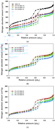 The nitrogen adsorption–desorption isotherms of SBA-15, Fe-SBA-15, Co-SBA-15, and Ni-SBA-15 are shown in Figure 3. The typical type IV adsorption isotherms for the SBA-15 and metal-impregnated SBA-15 were determined, and all of these materials exhibited H1-type hysteresis and revealed cylindrical channels. Results point out the blocking effect on the materials during the nitrogen sorption procedures, and the large metal doping aggregate pore structures were attributed to the effects.