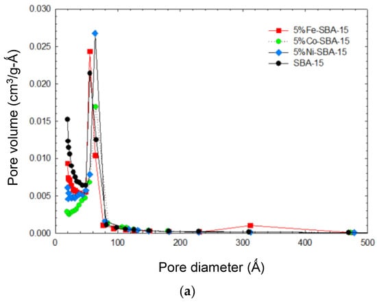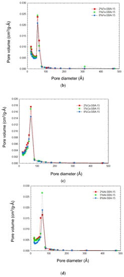 The average pore diameter of SBA-15 was 45.7 Å, and that of Fe-SBA-15 was 47.5–48.5 Å, Co-SAB-15 was 65.2–66.8 Å, and Ni-SAB-15 was 59.9–64.4 Å. This could have been caused by a partial blockage of the SBA-15 pores by cobalt oxide clusters and/or a partial collapse of the mesoporous structure, both of which resulted in an increase in pore diameter after metal impregnation [57,58]. Metal additives on SBA-15 have the potential to block pores and increase the average diameter of the pores. There was a 20–30% decrease in pore volume after metal oxides were impregnated on SBA-15. Metals additives were found to block the pores in the micro-and meso-ranges of SBA-15 and cause an increase in the average pore diameter. The pore volume reduction in metal-impregnated SBA-15 was at a pore diameter of less than 50 Ǻ (shown in Figure 4) compared with SBA-15. However, the Fe-impregnated SBA-15 presented a relatively high surface area and pore volume compared with both Co- and Ni-impregnated SBA-15. The decrease in the pore volume of Co-SBA-15 and Ni-SBA-15 in comparison with Fe-SBA-15 could have been caused by the blocking of the pores by the metal clusters. In addition, the low pH value (pH was from 2.4 to 1.9 corresponding to the 2 to 8% of Fe(NO3)3 solution) of the Fe(NO3)3 solution enhanced the reaction with SBA-15 particles that may have led to pore development, especially in mesopores (shown as Figure 4). According to the pore distribution, the pore volume was high in the pore diameter range of 50–60 Ǻ and the vicinity of 300Ǻ.