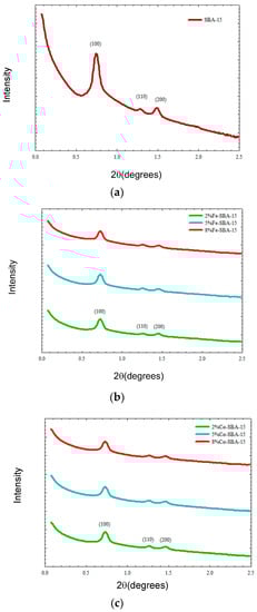 Figure 1 shows bundled rope-like structures for SBA-15 and metal-impregnated SBA-15 (Fe-SBA-15, Co-SBA-15, and Ni-SBA-15). Based on small-angle X-ray diffraction (Figure 5), there were three peaks determined for the SBA-15 lattice as (100), (110), and (200) at 2θ in the vicinity of 0.7, 1.2, and 1.4, respectively. There were three well-resolved diffraction peaks, which corresponded to the hexagonally ordered structure of SBA-15 [60].The metal oxide-doped materials also indicated the ordered hexagonal mesoporous structure but lowered the intensity of peaks after impregnation. Small-angle XRD was used to determine the two-dimensional hexagonal structure diffraction of SBA-15 and its metal oxide-doped materials (intensive peak at 2θ = 0.6–0.8) (Figure 5).