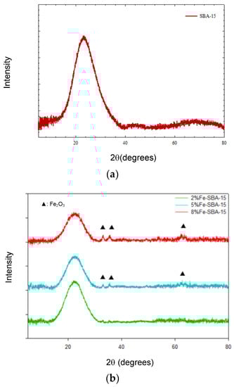 SBA-15 and metal oxide-impregnated SBA-15 exhibited a broad silica peak near 23.8°, indicating the amorphous silica on the support (Figure 6).