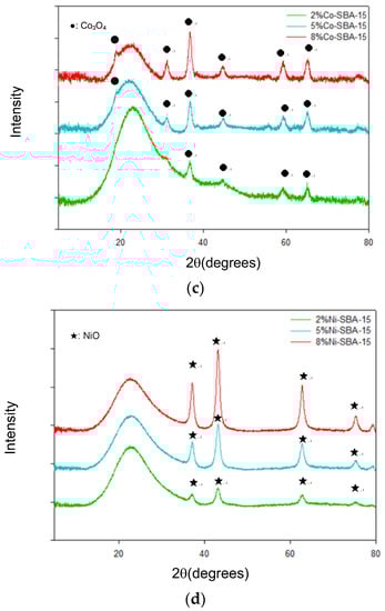 (a) XRD analysis of SBA-15. (b) XRD analysis of 2–8 wt% of Fe-SBA-15 (▲: Fe2O3). (c) XRD analysis of 2–8 wt% of Co-SBA-15 (●:Co3O4). (d) XRD analysis of 2–8 wt% of Ni-SBA-15 (★:NiO).