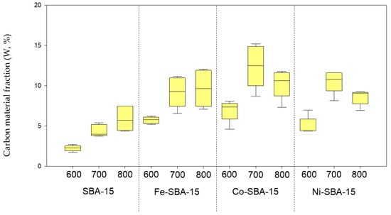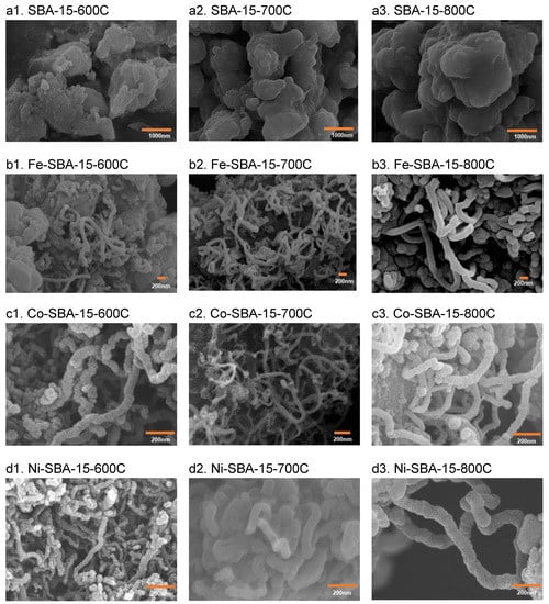 Carbon materials formation on SBA-15, and Fe-, Co-, and Ni oxides-impregnated SBA-15 at 600, 700, and 800 °C.