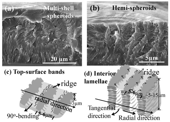 SEM micrographs of the interiors of two different banded PDT spherulites both melt crystallized at 90 °C: (a,b) nuclei near top surface–multi-shell hemispheroids; (c,d) schemes for the optical birefringent patterns and top vs. interior assembly (sample film thickness = ca. 20–30 μm).