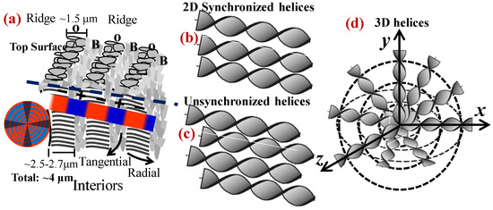 Figure 11a,b show the general schemes depicting the interior and top-surface vs. interior, respectively, of the universal grating assembly in the periodically assembled crystals. Figure 11c is the SEM micrograph for PDoT revealing both the top-surface bands and interior lamellae directly underneath these periodic bands. Figure 11d shows an enlarged scheme of the fractured interior along the radial direction on the top surface, as well as the interior. The dimensions of the interior radial-oriented lamellae approximately matches with that of the ridge band on the top surface. The exact measures of these two dimensions may differ slightly, which is due to the fact that as the interior tangential lamellae emerge upward to the top surface, they have to bend downward to become radial-oriented lamellae. By contrast, the interior radial lamellae simply branch out horizontally till impinging with the next tangential layer. Thus, the interior radial lamellae tend to be slightly longer (2.6–2.8 μm) than the top-surface radial-oriented lamellae on the ridge band (ca. 2.1 μm). Note that the tangential layer was ca. 1.5–2.0 μm; thus, the total thickness of radial+tangential shells would be roughly 4–5 μm, which is the cross-bar pitch of the corrugate-board structure in PDoT at Tc = 96 °C.