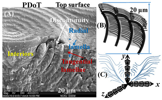 SEM micrographs for comparisons of the assembly analogy of interior lamellae for three arylates: (A) PDoT (P12T)-banded spherulite melt crystallized at Tc = 96 °C, with shell thickness: 4 μm (same as optical inter-band spacing); (B) PTT (P3T)-banded spherulite melt crystallized at Tc = 165 °C, with shell thickness = 10 μm (=optical inter-band spacing) [31]; (C) type-1 ring band of PNT (P9T) crystallized at Tc = 85 °C, with shelled thickness = 8 μm (cross-bar pitch = optical inter-band spacing). (Figure 7B Reprinted with permission from ref. [31]. Copyright 2017 American Chemical Society ).