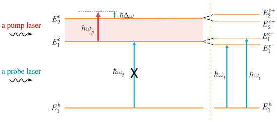 The following is the explanation for the formation of the new peaks. When there is no pump laser present, at the beginning of the investigation, two initial electron levels and provide for four possible electron states. These two initial levels combine to form a single level in the presence of a high-power resonant pump laser, eliminating the possibility of two allowed electronic states. Therefore, each level, and , must be divided into two sublevels, and , in order to preserve the number of allowed electronic states (see the right side of the schematic in Figure 3). However, due to the selection rule in the QD structure, we only see two peaks in the absorption spectra, that correspond to two interband transitions, from the hole level to two electron sublevels and , not from the hole level to two sublevels, and (Figure 3). For ease of understanding, the new peak, that has an energy greater than the initial peak, is referred to as the “higher energy peak”, and the other is referred to as the “lower energy peak”.