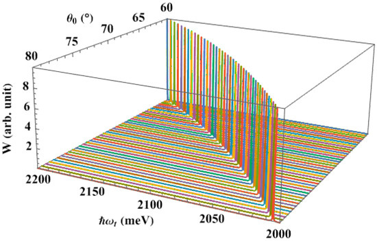 Next, we calculate the dependence of the interband absorption spectra, in the absence of the pump laser, on the apical angle of the QD, Figure 5. Here, we also observe a single absorption peak in the spectra. We see that when the apical angle expands, the absorption peak shifts to the lower energy region, giving us the same redshift as in the earlier study. This result makes sense, because the energy levels of the carriers decrease as the apical angle rises, bringing them closer together. Therefore, the QD only has to absorb a low-energy photon to stimulate the optical transition from the hole level to the lowest level of the electron. This shift happens more quickly if the apical angle is smaller, in particular. It is really an interesting point. It appears that the dot apical angle, together with its dot size, has a significant impact on the interband absorption spectra. One of the novel findings of this research, and what sets it apart from earlier studies [62,72], is the substantial apical angle dependency of the interband absorption spectra.