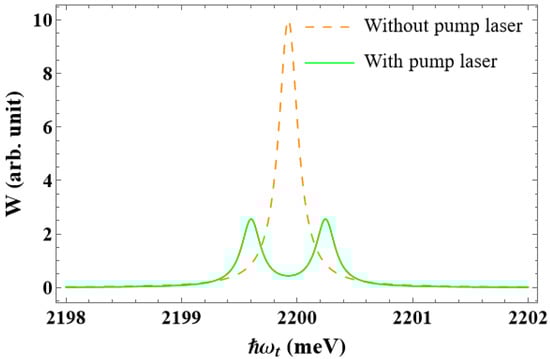By substituting the functions in Equation (31) with a narrow Lorentzian function, similar to those in Equation (21), the equation may be made simpler. From this, we can derive the final expression of the transition rate under the effect of a strong pump laser as: