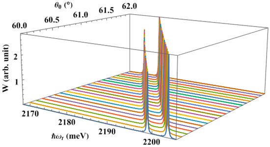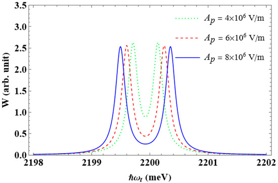 The effect of the pump laser’s amplitude, , on the interband absorption spectra, is seen in Figure 10. As can be seen from the graph, the height of the two new peaks does not change significantly for any value of the amplitude, but their separation increases as it grows. The following is an explanation. According to Equation (12), increasing the amplitude causes the value of the matrix element to rise, which raises the Rabi frequency, (see Equation (24)). Additionally, the energy interval between the two splitting levels, and , is larger as the Rabi frequency grows, because this energy difference is twice the Rabi energy, (see Equation (28)). Consequently, the two splitting peaks move farther apart as the amplitude grows.