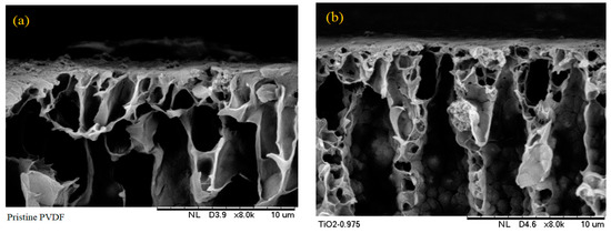 The membranes’ morphology was studied using a scanning electron microscope (SEM) to represent the cross-sectional and surface of the membranes at various magnifications. Figure 2 shows SEM micrographs of the prepared PVDF UF membranes’ cross-sectional morphology at magnifications of 8.00 k. All prepared membranes had asymmetric morphology with a finger-like structure on top and a sponge-like structure on the bottom. Figure 2a depicts a pristine PVDF with no additives showing a thin skin layer and an asymmetric structure with a finger-like structure on the top membrane. The SEM images showed the morphological changes and suppressed the finger-like macro voids on the surface of the PVDF membrane, revealing the successful incorporation of TiO2 nanoparticles, PVP, and PEG. The pure PVDF membrane surfaces had a larger pore size which is consistent with [19]. Noticeable changes in morphology were seen with the addition of inorganic TiO2 nanoparticles and different pore-forming agents (PVP and PEG) in which the inner and outer finger-like macro voids were suppressed (Figure 2b–f). The finger-like structure beneath the top layer and the entire membrane structure was made of 16 %.wt PVDF. There was also a transition from the macroporous to the asymmetric structure in the membrane cross-section. A sponge-like substructure and a thicker layer of membranes were formed at the bottom of the membrane. A small amount of TiO2 nanoparticles was added to improve membrane morphology. TiO2 nanoparticles have a high specific area and are hydrophilic which will impact mass transfer during the fabrication process [25,28].
