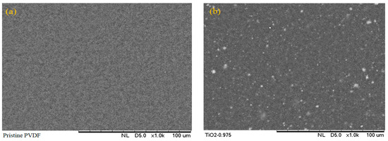 Top surface SEM micrographs of PVDF–TiO2 MMMs are shown in Figure 3. Connected pores on the surface of all membranes were observed at magnifications of 1 k (see Figure 3). Identified TiO2 nanoparticle dispersion in the synthesized membranes was consistent with the theory postulated by [39] which states that the thermodynamic stability of nanoparticles in a polymeric liquid is strongly correlated with the ratio of the linear polymer’s radius of gyration (Rg) to the radius of the nanoparticles (Rp) [8].
