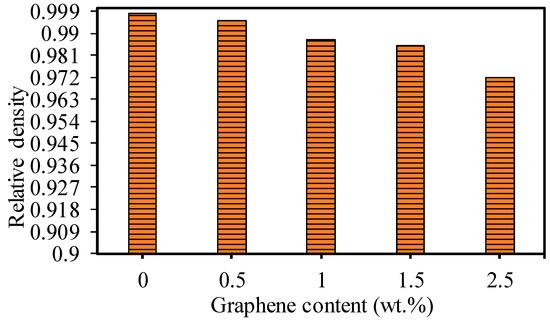 - All of the produced GNP-based Al2O3 nanocomposite samples exhibited high relative densities between 97.17% and 99.79%, which indicates good bonding between the GNPs and the Al2O3 matrix without porosity or cavities.