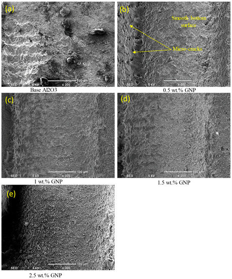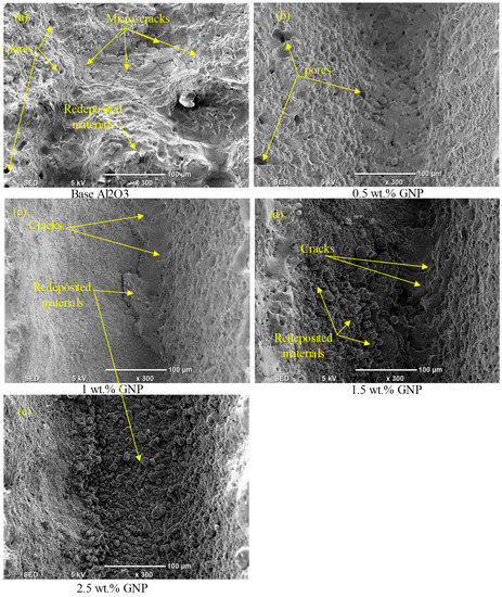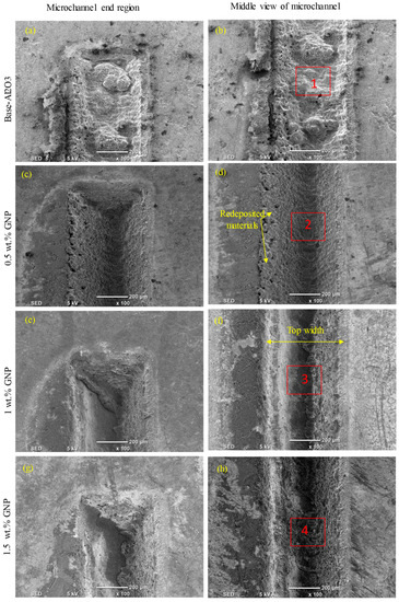 - The SEM examination revealed that the inclusion of graphene contents had a profound influence on the surface morphology of the machined microchannels. The base Al2O3 samples showed inferior surface quality, with pores, more redeposited materials, and microcracks. All of the GNP/ Al2O3 nanocomposites showed improvement in morphology compared to the base Al2O3 samples. This was due to the lower ablation threshold energy of the graphene based-nanocomposites.