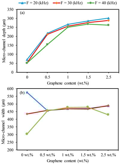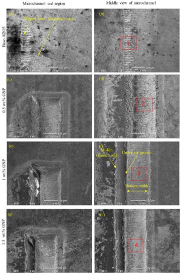 - The roughness of the machined microchannels was affected by the GNP reinforcement. The nanocomposites with lower GNP contents exhibited the lowest surface roughness compared to the other samples. Among the machined nanocomposites, the 0.5 wt.% GNP samples showed the lowest surface roughness.