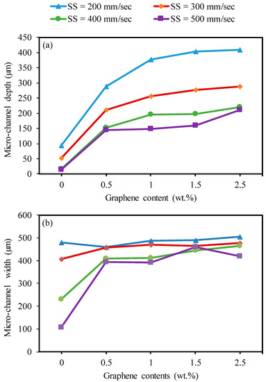 - The ablation depth was significantly affected by the GNP reinforcement. The GNP/Al2O3 nanocomposites exhibited improvement in the ablation depth compared to the base Al2O3 in all machining conditions. For example, at a scanning speed of 500 mm/s, the ablation depths increased by 9.8, 10.04, 10.9, and 14.6 times, respectively, compared to the base Al2O3. This was because the graphene reinforcements reduced the ablation threshold energy required to induce the materials and increased the material removal efficiency due to higher optical absorbance, thermal conductivity, and a smaller grain size.