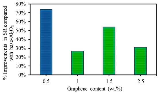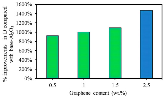 - The hardness was moderately affected by the GNP reinforcement in the Al2O3 matrix. Nanocomposites with 0.5 wt.% GNPs demonstrated a slight improvement in hardness by approximately 6.3% compared to the base Al2O3. In comparison, other nanocomposites exhibited a slight decrease in hardness.