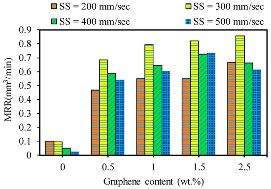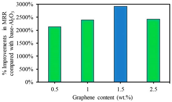 - The MRRs during the laser micromachining were significantly affected by the GNP reinforcement in the Al2O3 matrix. For example, at a higher scanning speed, the MRRs were increased by 2134%, 2391%, 2915%, and 2427% for the 0.5 wt.%, 1 wt.%, 1.5 wt.%, and 2.5 wt.% GNP/Al2O3 nanocomposites, respectively, compared to the base Al2O3 ceramic.