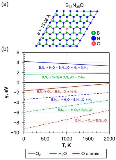 However, according to the reference experimental data [26,27], oxygen tends to heal the nitrogen vacancies in the BN structure with the formation of BxNx−yOy composition. Our computations confirm the thermodynamic favorability of such a process for all studied oxygen in the entire temperature range considered by calculating the γ including defective h−BxNx−y as the initial structure (see Figure 1b, dashed lines). In the presence of a Nv defect in the initial structure, the incorporation of oxygen is a favorable process for all considered oxygen sources; therefore, the healing of nitrogen vacancies should occur spontaneously.