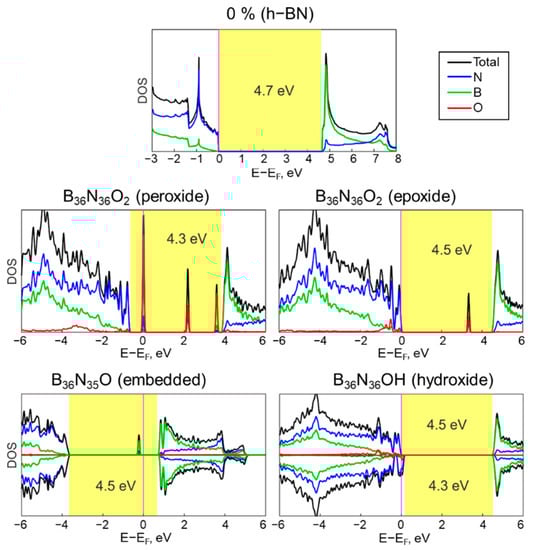 As shown in Figure 3, in the framework of the chosen approach, the pure h−BN monolayer displays band gap of 4.7 eV, which is consistent with previous theoretical studies [38]. The adsorption of oxygen-containing groups leads to the appearance of impurity levels and slight decreasing of the band gap value to 4.3–4.5 eV. The projected density of states (PDOS) by oxygen (red lines), boron (green lines), and nitrogen (blue lines) atoms show that the localized impurity states are mainly determined by the oxygen atoms and, to a lesser extent, by the neighboring boron or nitrogen atoms.