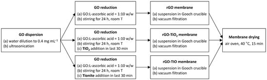 Two different types of rGO-based membranes were produced: rGO–TiO2 and rGO–TIO, combining rGO with either Degussa P25 TiO2 or tionite. Pure rGO membranes were also prepared as a benchmark.