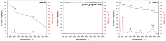 Thermogravimetric plots of (a) rGO, (b) Degussa P25 TiO2, and (c) tionite.
