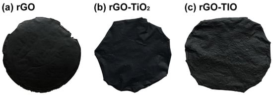 Pictures of the produced membranes: (a) rGO, (b) rGO–TiO2, and (c) rGO–TIO.