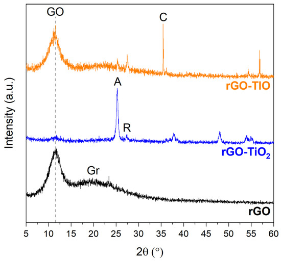 Hence, the phase composition of the membranes corresponds to a mixture of the original components, as confirmed by XRD analysis as well (Figure 6). Accordingly, in both rGO–TiO2 and rGO–TIO membranes, it is possible to identify the characteristic reflection at 11°, consistent with the layer spacing of GO. Other main reflections, at about 25° and 27°, correspond to the anatase and rutile phases, respectively. In the case of tionite-based membranes, the presence of calcite was also detected, confirming its presence in the membrane. By comparing the three diffractograms, it is possible to underline that the GO reflection is not affected, in either position or shape, by the combination with TiO2 and tionite, thus suggesting the absence of intercalation or intimate crystallite interaction with the single layers of rGO.