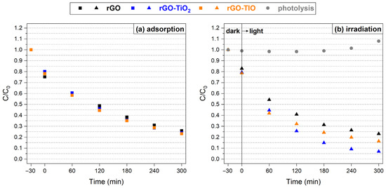 When the experiment is repeated under UV light irradiation (Figure 9b), a slight change in the C/C0 curves can be observed. The concentration drops more rapidly in the first hour of illumination and, after 5 h, the initial amount of Imidacloprid® is reduced to about 23%, 7%, and 16%, respectively, for the solutions put in contact with rGO, rGO–TiO2, and rGO–TIO. Such a decrease can be fully ascribed to the photodegradation ability of each membrane, considering that no photolytic effects were detected in the absence of the photocatalysts.