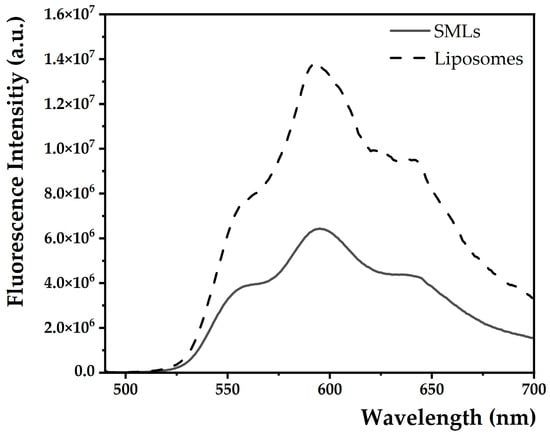 Using fluorescence emission measurements, it was possible to prove that the shape anisotropic magnetic nanoparticles were efficiently surrounded by a lipid bilayer. Fluorescence emission spectra of doxorubicin in liposomes and SMLs loaded with the same concentration of DOX and with the same lipid concentrations confirm its encapsulation (Figure 6). In the SMLs aqueous solution, a reduction in DOX fluorescence intensity compared to the liposome sample is evident. This occurs because the MNPs present in the magnetic core of SMLs act as quenchers of the fluorescence emitted by DOX. This quenching effect results from the broad absorption spectrum of calcined mixed ferrites, which have the capacity to absorb part of the energy emitted by the fluorescent compound after its excitation at 480 nm. Still, this phenomenon can also be explained by photoinduced electron transfer, as well as an increase in intersystem crossing efficiency due to the heavy atom effect. The latter prevails in fluorescence inhibition in this type of nanosystem.