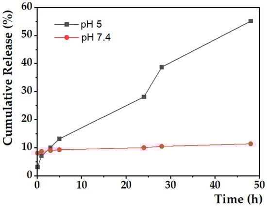 The release profile of doxorubicin from the SMLs was determined at pH = 5 and pH = 7.4 by fluorescence measurements. Figure 7 shows the strong dependence of the release rate on the medium pH. After 20 h, the drug release starts to be much more pronounced in acidic medium compared to that at physiological pH, reaching about 55% release after 48 h, while at pH = 7.4, a maximum of only 11% is achieved. On the one hand, at neutral pH, the DOX release percentage is almost invariable, showing that drug release is prevented. On the other hand, at pH = 5, an increased and continuous release is observed over time as a result of membrane destabilization at this pH. Furthermore, a saturation release was not achieved after 48 h, indicating that there is a gradual destabilization of the biomembrane, promoting the release of its content.