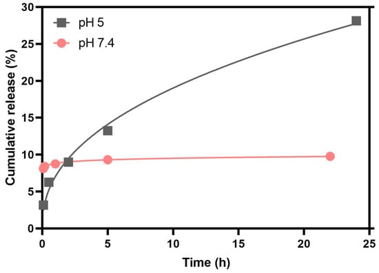 Cumulative release profiles (average of three replicas) of doxorubicin (%) over time (h) encapsulated in SMLs at pH = 5 (gray line) and pH = 7.4 (red line).