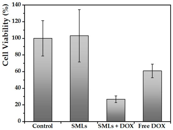 Viability of untreated HepG2 cancer cells (control) and in the presence of solid magnetoliposomes without DOX (SMLs) and with DOX encapsulated at 5.65 × 10−5 M (SMLs + DOX), as well as in the presence of drug in free form at 5.65 × 10−5 M (Free DOX).