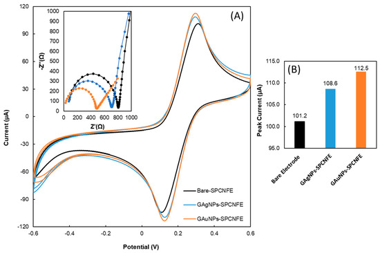 (A) Cyclic voltammograms, Inset: Nyquist diagram (recorded in 5 mmol L−1 [Fe(CN)6]−3/−4 and 0.1 mol L−1 KCl), and (B) bar graph of the bare screen-printed carbon nanofibers electrodes (SPCNFE), green synthesized silver and gold nanoparticles modified SPCNFE in 5 mmol L−1 [Fe(CN)6]−3/−4 in acetic acid/acetate buffer 0.1 mol L−1 pH 4.5.