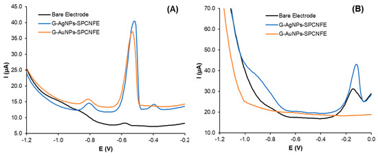 Figure 7A,B show the cadmium determination voltammograms using G-AgNPs-modified and G-AuNPs-modified SPCNFEs, respectively. In both cases, the Cd(II) stripping peak was around −0.8 V. The calibration plots confirmed that the peak area increased as the cadmium concentration increased with good correlation coefficient values.