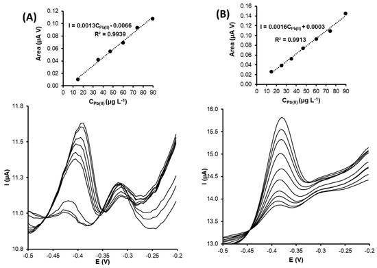 Figure 6A,B show the voltammograms and calibration plots obtained for Pb(II) detection using green-AgNPs-based and green-AuNPs-based electrodes. In both graphics, it is possible to relate the peak area to the applied potential between −1.2 V and −0.2 V.