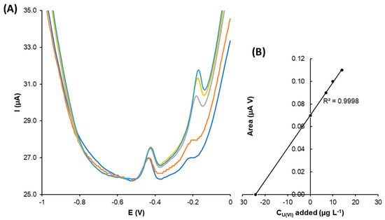 The stripping peak corresponding to uranyl was observed at around −0.15 V. The calibration curves were recorded using DPASV, and the uranyl ion concentration increased from 5 to 49 µg L−1. As in the previous cases, the calibration plot confirmed that the peak area increased with the concentration, showing a good correlation coefficient value. The obtained limit of detection was 5.2 µg L−1.