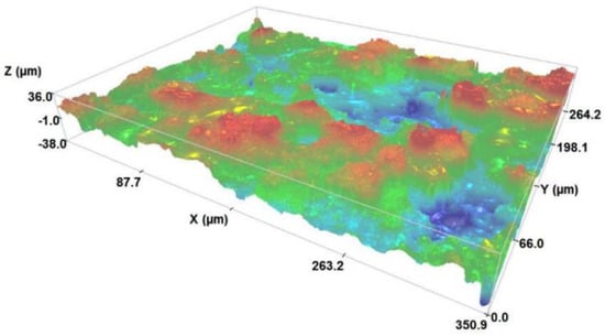 Additionally, optical profilometry measurements were also performed to determine the average surface roughness (Sa) of the coatings. These measurements were carried out using a Sensofar S Neox 3D optical profiler. It was found that the Sa values are 10 ± 1 µm mark. A 3D surface topographical map of a coating is presented in Figure 3 showing the rough surface of the samples. It should be noted that this map is very representative of the results obtained in different sample surface zones and in similar samples produced under the same conditions, which confirms the advantage of this method in the thickness and roughness reproducibility of the deposited film. This measurement was performed in 10 APS Hap-coated samples.