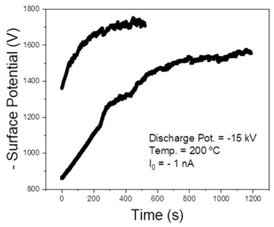 Example of two surface potential buildup curves for two APS Hap coatings negatively charged with a constant current of −1 nA.