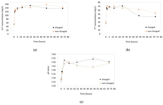 The variation of the Ca2+ (a) and P5+ (b) ionic concentrations and of the pH value (c) for increasing immersion times in the SBF solution (0, 1, 3, 6, 12, 24, 48 and 72 h), for the charged and non-charged samples. The first value at 0 h is equal for both samples, matching the initial concentrations and pH value of the SBF solution.