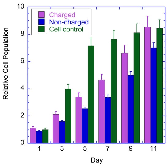 The results contained in Figure 7 display the osteoblastic cellular proliferation in the charged and non-charged coatings for increasing culture times. Firstly, the control population exhibits an expected behaviour: a fast-initial growth and later, a slower rate due to the stabilization of the number of cells in the area of the culture plate well. It is also normal for the control population to increase faster than the samples in the first days. The sample results indicate that, for all the culture times, the osteoblastic proliferation is higher in the charged coatings, compared to the non-charged coatings, and becomes more evident for higher culture times (also observed in the literature, for instance, Bodhak et al. [12]). Therefore, despite the fact that the biological tests started one month after the corona charging experiments, the stored charge is clearly able to stimulate osteoblastic proliferation.