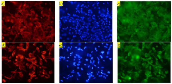Immunofluorescence images obtained five days after culture. The red fluorescence indicates the cytoskeleton of the osteoblasts, the blue fluorescence indicates the osteoblasts’ nuclei and the green fluorescence indicates vinculin protein. Images (a–c)—charged APS Hap coating; (d–f)—non-charged APS Hap coating. The images were obtained with the 40x objective, and correspond to an area of about 330 µm × 424 µm.