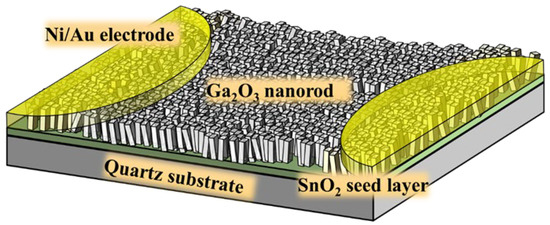 Figure 1 shows the schematic configuration of the Ga2O3 nanorod-structured NO2 gas sensors. A radio frequency (RF) magnetron sputtering system was used to deposit SnO2 films with various thicknesses of 50 nm, 100 nm, and 200 nm on quartz substrates as seed layers for GaOOH nanorods. The RF power, the Ar/O2 gas ratio, and the chamber pressure were maintained at 75 W, 48/2 sccm, and 5 mtorr, respectively. The growth rate of the SnO2 films was approximately 6.8 nm/min. After completing the various SnO2 seed layers, the GaOOH nanorods were grown on quartz substrates using the hydrothermal synthesis method with various concentration solutions consisting of Ga(NO3)3·9H2O and HMT at 180 °C for 4 h using a magnetic stirrer hotplate. The nanorods were then converted from GaOOH to Ga2O3 in a pure N2 ambient atmosphere using a furnace system for 2 h at 300 °C, 400 °C, and 500 °C, respectively. The hydrothermal synthesis processes and the material conversion during the thermal annealing processes are described in Equations (1–4), respectively [22].