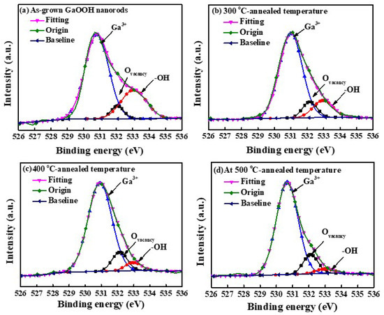 XPS spectra of O1s core-level spectra of (a) as-grown GaOOH nanorods and annealed Ga2O3 nanorods treated at (b) 300 °C (c) 400 °C, and (d) 500 °C.
