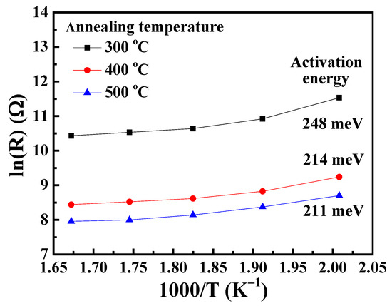 where R0 is the pre-exponential factor, k is the Boltzmann constant, and T is the absolute temperature, respectively. The activation energy is determined by the slope of the Arrhenius plot. As shown in Figure 7, the activation energy of 248 meV, 214 meV, and 211 meV corresponded to the NO2 gas sensors with Ga2O3 nanorod sensing membranes annealed at 300 °C, 400 °C, and 500 °C, respectively. In general, the activation energy was inversely proportional to the carrier concentration [31,32], which was also increased with the amounts of oxygen vacancies in the Ga2O3 material [33]. According to the XPS results, the oxygen vacancies residing on the surfaces of Ga2O3 nanorods were effectively increased during the annealing treatment process. Consequently, it could be deduced that the activation energy was decreased with an increase in the annealing temperature.