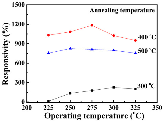 where Rg and Ra are the resistances of the NO2 gas sensors in NO2 gas and air environments, respectively. Figure 8 shows the responsivity versus operating temperature characteristics of the NO2 gas sensors with Ga2O3 nanorod sensing membranes annealed at various temperatures. Under a bias voltage of 1 V and a NO2 gas concentration of 10 ppm, the optimal responsivity of the NO2 gas sensors with Ga2O3 nanorod sensing membranes annealed at 300 °C, 400 °C, and 500 °C was 225.8%, 1184.6%, and 824.9%, respectively. The corresponding operating temperatures of the optimal responsivity were 300 °C, 275 °C, and 250 °C. It could be found that the responsivity increased with an increase in the annealing temperature until 400 °C and then decreased when further increasing the annealing temperature to 500 °C. The reduction in operating temperature tendency was followed by the activation energy tendency of the annealing temperature of the Ga2O3 nanorod sensing membranes. The enhanced responsivity was attributed to the fact that the annealing thermal energy could effectively increase the oxygen vacancies, thereby providing more gas-reactive surface sites. However, the improvement responsivity of the NO2 gas sensors with 500 °C-annealed Ga2O3 nanorod sensing membranes was degraded. It could be deduced that the induced excessive carrier concentration present in the 500 °C-annealed Ga2O3 nanorod sensing membranes could reduce the resistance variation [34].