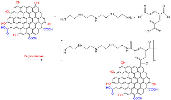 Interfacial polymerization was used to graft polymer chains onto graphene oxide. The obtained graphene oxide was mixed and dispersed with 2% w/v of polyethyleneimine in water, by sonication. After 3 h, trimesoyl chloride (0.10% w/v) in hexane, was dropwise introduced into the system under vigorous stirring. To attain complete polymerization, the system was stirred for one day. PEI/GO was separated and rinsed with solvent. The obtained PEI/GO was dried in a freeze-dryer. Figure 1 illustrates the formation of the synthesized PEI/GO.